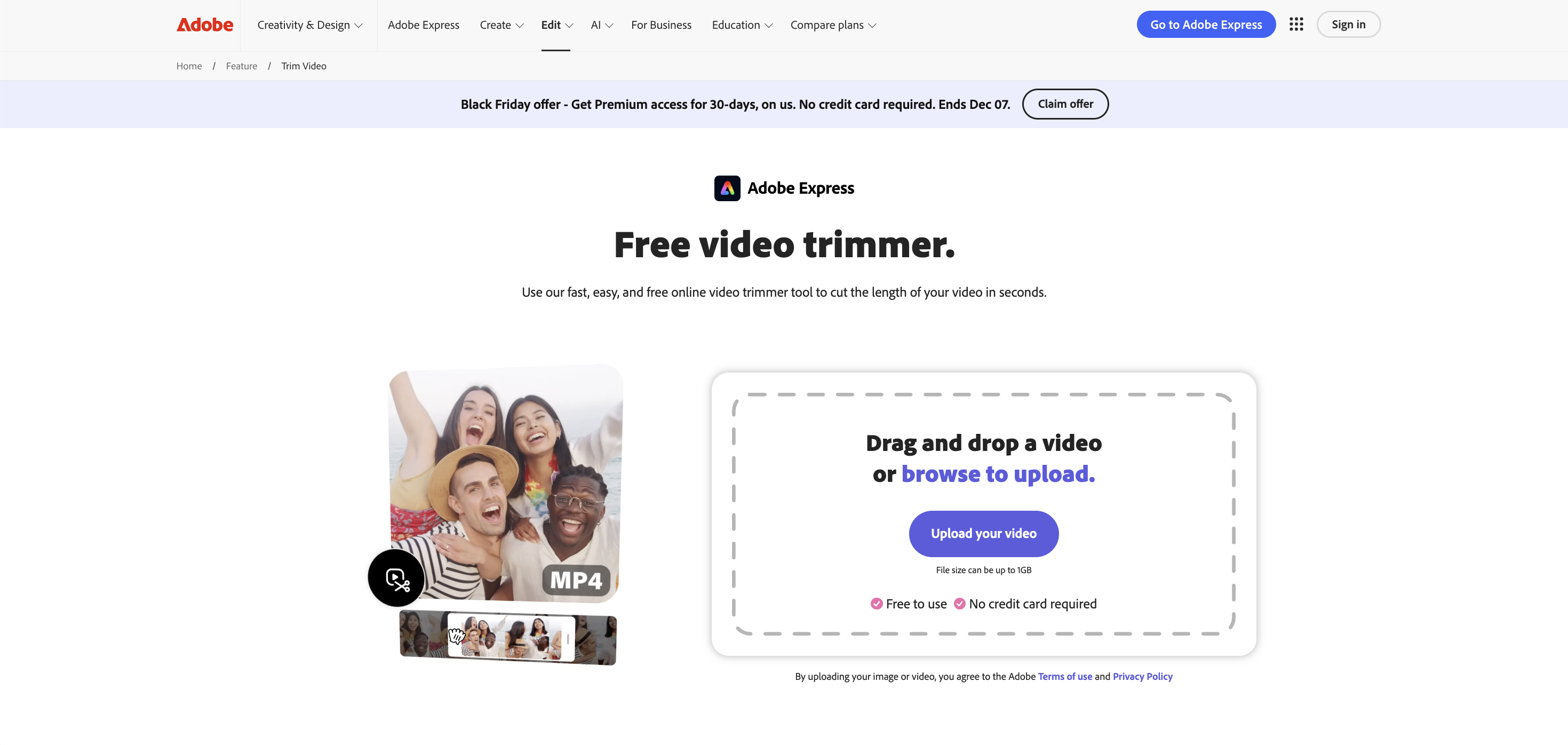 Adobe Express brings Adobe’s quality to a lightweight browser tool. You get clear trimming controls without the complexity of Premiere Pro.